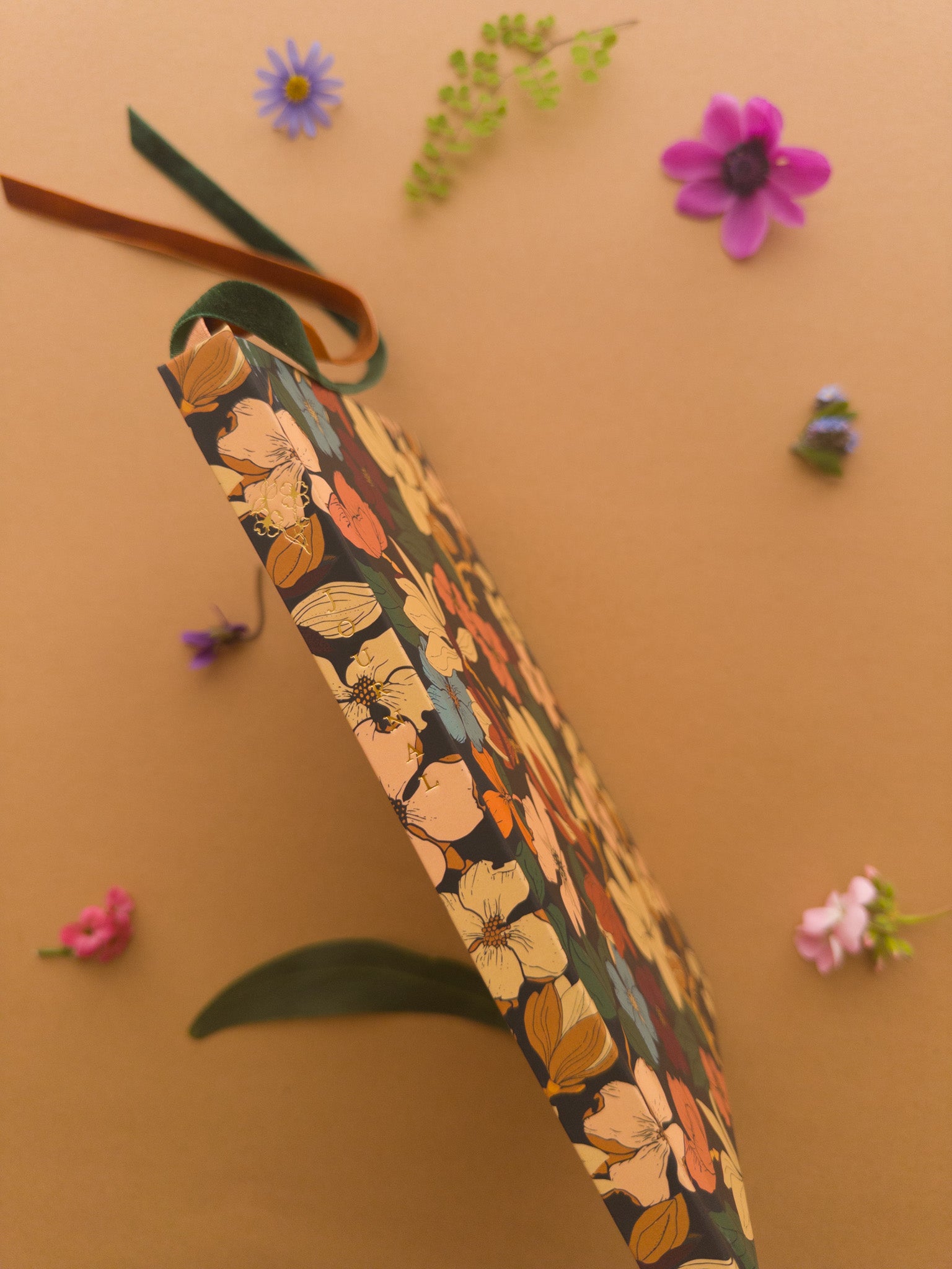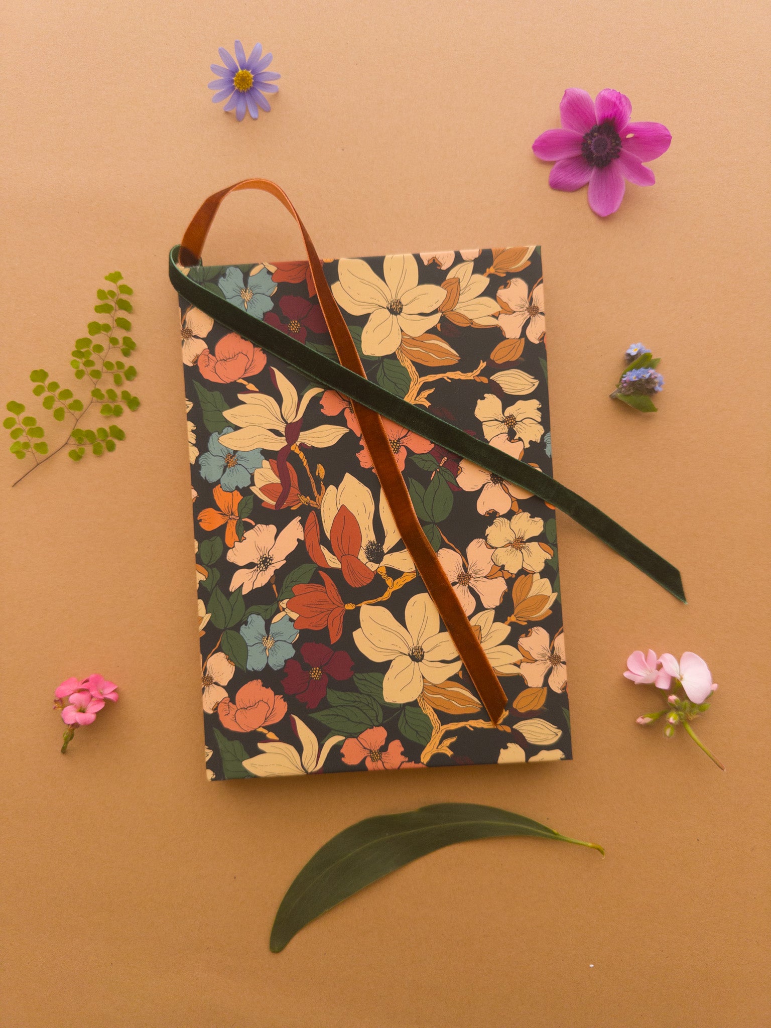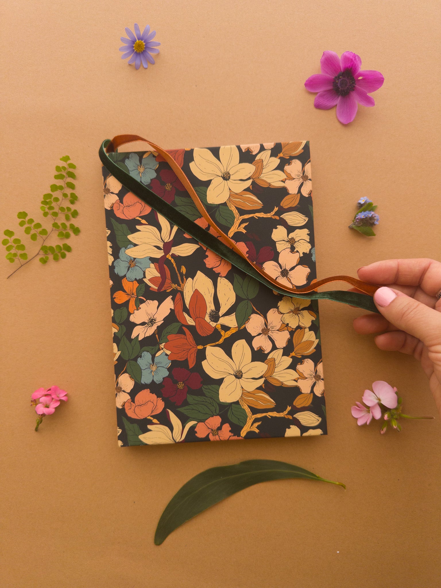 Moody magnolias take you Down the Garden Path in this stunningly rich design. Featuring earthy burgundies and burnt oranges in our Winter Magnolia pattern and the most luxurious deep green and copper velvet ribbons.